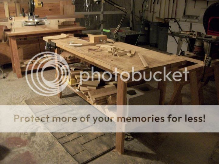Heres my workbench. 28" x 6 Base made of 2x4s The table is three side-by-side 2 x 10 topped with a thin sheet of oak that was in my garage when I bought the house. It has a little, cheapo vise that works for most things.The workbench isnt the sturdiest so I store my cinder block and another concrete block (under the newspapers) to help. The concrete pieces work as clamps, too. Overall, it is the perfect size for me and my projects. I can drill dog holes into it or drip glue or stain on it without worrying.